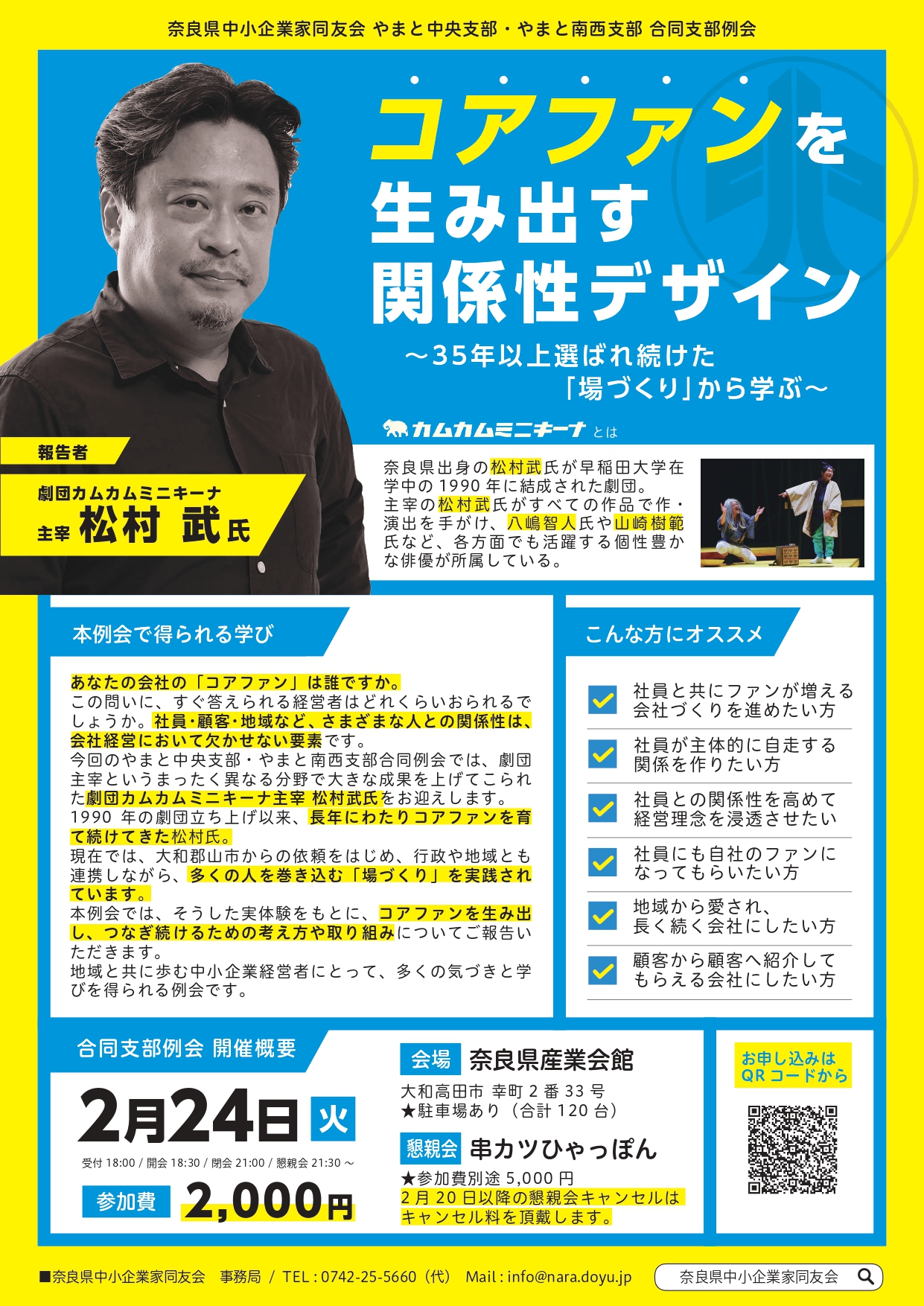 今回のやまと中央支部・やまと南西支部合同例会では、劇団主宰というまったく異なる分野で大きな成果を上げてこられた劇団カムカムミニキーナ主宰 松村武氏をお迎えします。